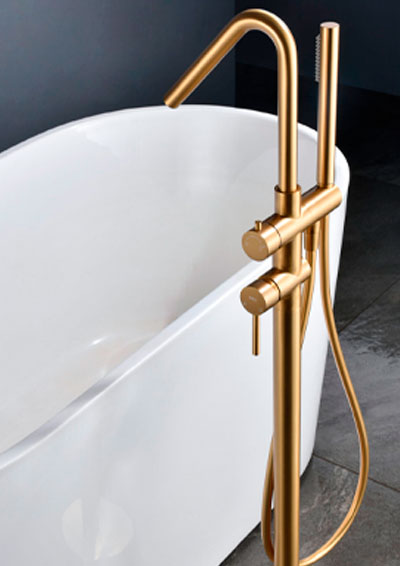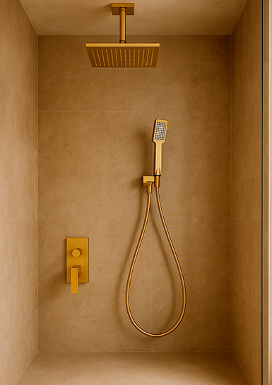 Ducha dorada oro cepillado ideal para baño con pared gris mate